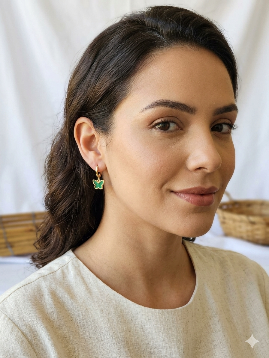 Delicado e cheio de charme, o brinco argola com pingente de borboleta verde é a escolha perfeita para quem ama acessórios modernos e femininos.