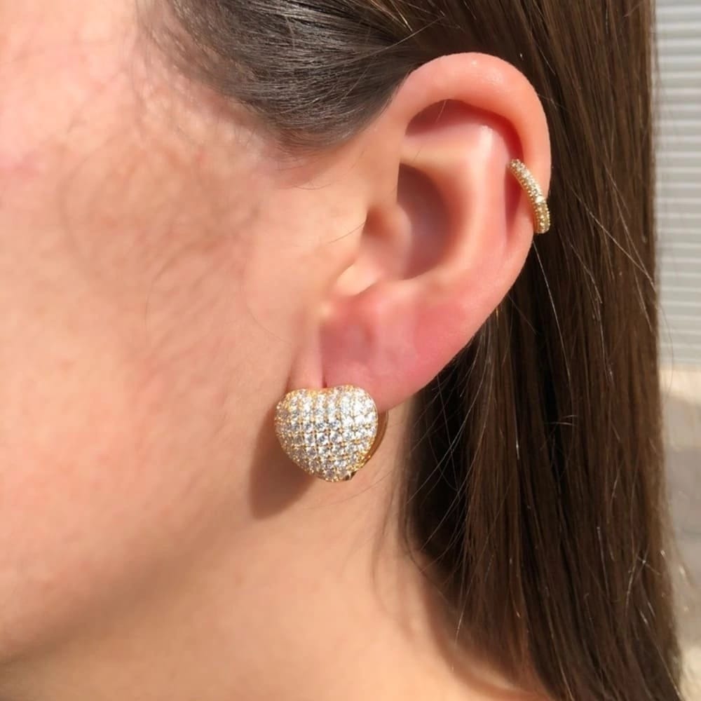 Um brinco com design diferenciado e moderno, coração duplo com micro zircônias cristais cravejadas, que trazem luxo e elegância! Modelo ideal para quem gosta de um acessório mais trabalhado e diferente. Banhado à ouro 18K, esse lindo modelo vai trazer sofisticação para seu look.