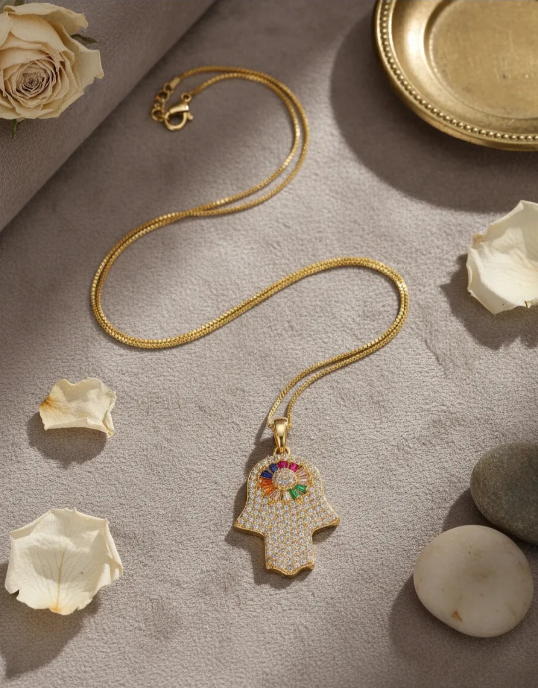 Corrente modelo veneziana com pingente de Mão de Fatima/ Hamsá, cravejado em zircônias cristal e detalhes em zircônias coloridas.