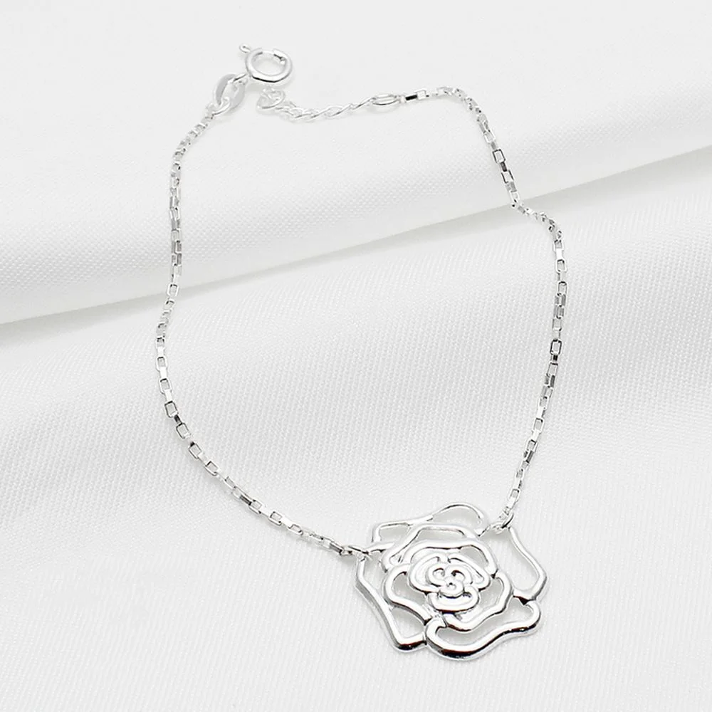 Delicadeza e elegância em cada detalhe. A Pulseira em Prata 925 com corrente veneziana longa e pingente de rosa vazada é perfeita para quem ama joias femininas e sofisticadas.